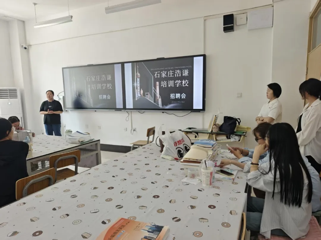 接下来由石家庄浩谦培训学校主讲人进行介绍。浩谦主讲人向我们介绍了学校的招聘要求和在学校进行的工作。