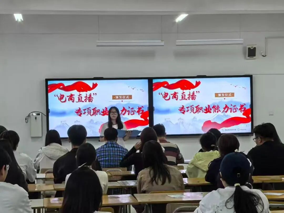 随后,赵思老师上台对证书进行讲解。她对所有顺利通过考核的同学表示最热烈的祝贺。赵老师提到,看到同学们从理论到实践的飞速成长,作为老师感到无比欣慰。她鼓励大家,拿到证书只是一个开始,希望大家能将所学运用到未来的职业道路上,在电商直播的浪潮中乘风破浪,闯出自己的一片天!