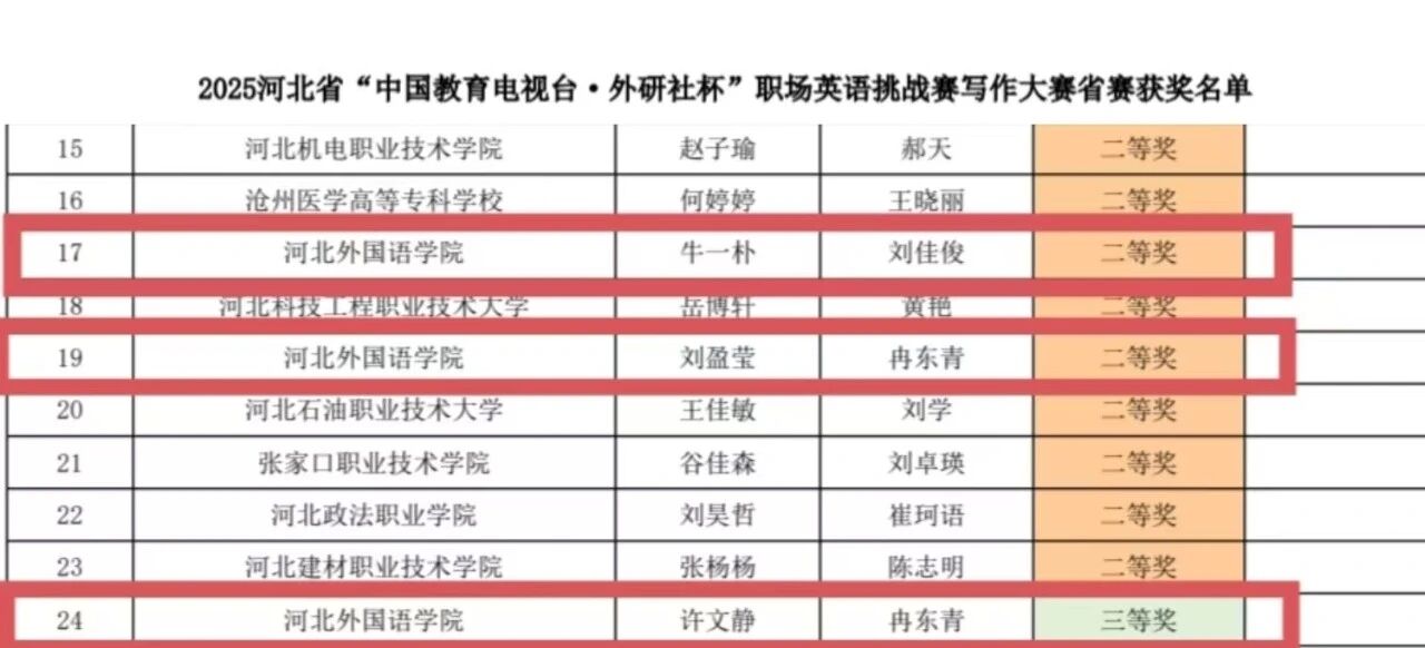 2025年11月8日,2025“中国教育电视台·外研社杯”职场英语挑战赛写作大赛落幕。河北外国语学院国际商学院有63名优秀学生晋级省赛,其中有三位同学成绩优异,凭借自己的努力和扎实的知识入围省赛前茅。牛一朴同学和刘盈莹同学荣获省级二等奖,许文静同学荣获省级三等奖。
