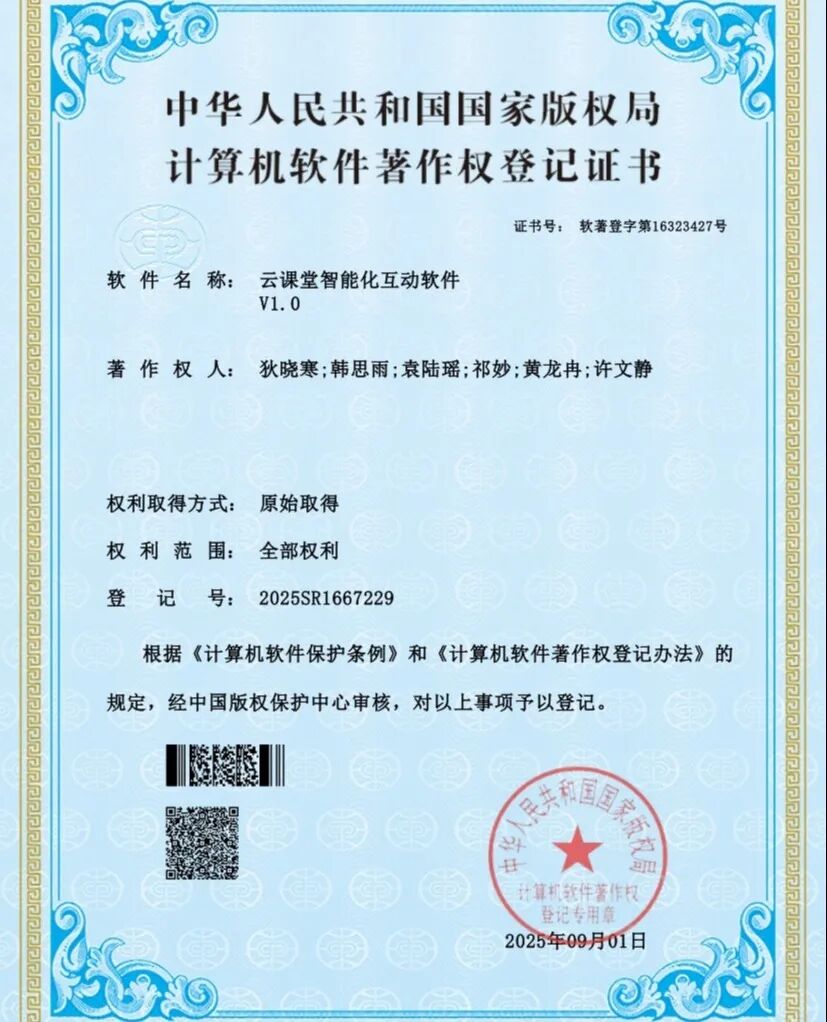 我们注重将理论研究转化为实际应用,共成功登记6项国家计算机软件著作权。这些成果是学生们研发能力的直接体现,分别为: