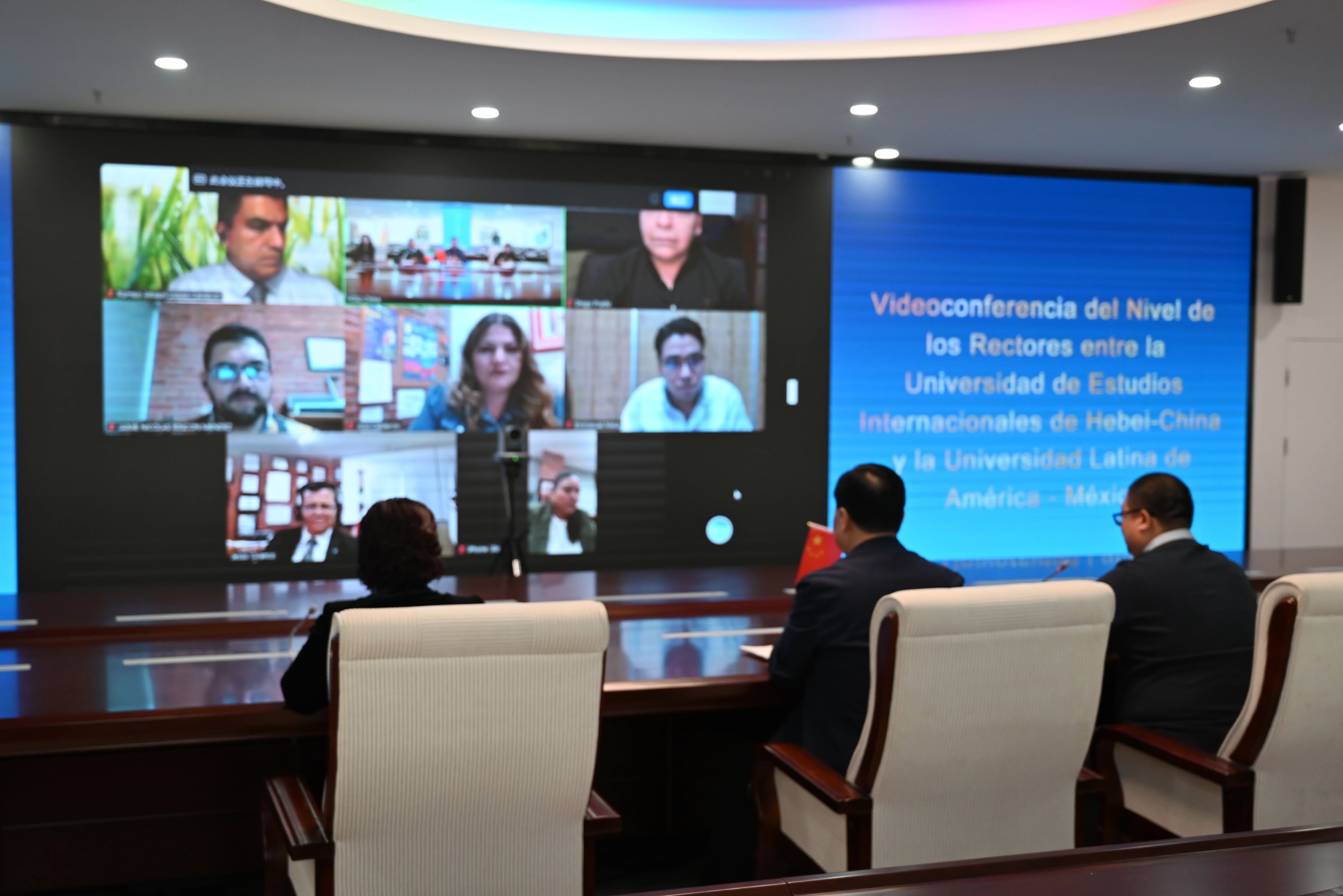 会上,河北外国语学院董事长、校长孙建忠院士,副董事长、执行校长习伟,校长外事助理、副校长杨振,校长办公室副主任张帆与墨西哥拉丁美洲大学校长赫苏斯·维万科·罗德里格斯教授,学术副校长格洛丽亚·萨拉戈萨·拉米雷斯教授,行政副校长埃马纽埃尔·梅萨·马加尼亚教授,发展和宣传副校长乔斯琳·卡尔德隆·古兹曼教授,国际化和学术交流处处长迭戈·普拉多·佩雷斯教授,战略规划处处长罗密欧·阿毛里奥·洛佩兹·卡尔德隆教授,就学生双向流动计划、共建墨西哥拉丁美洲大学孔子学院、共建墨西哥文化中心、墨西哥拉丁美洲大学校长代表团访问事宜、免费国际课程邀约五大议题进行合作交流。