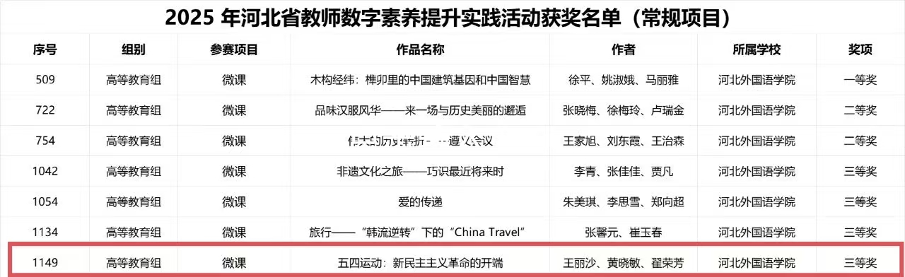 在2025年河北省教师数字素养提升实践活动中,河北外国语学院国际商学院王丽沙、黄晓敏、翟荣芳三位教师,依托《中国近现代史纲要(2023年版)》教材,为大一第二学期本科各专业学生打造的数字化教学成果斩获荣誉,彰显了学院在思政课数字化转型中的扎实探索。
