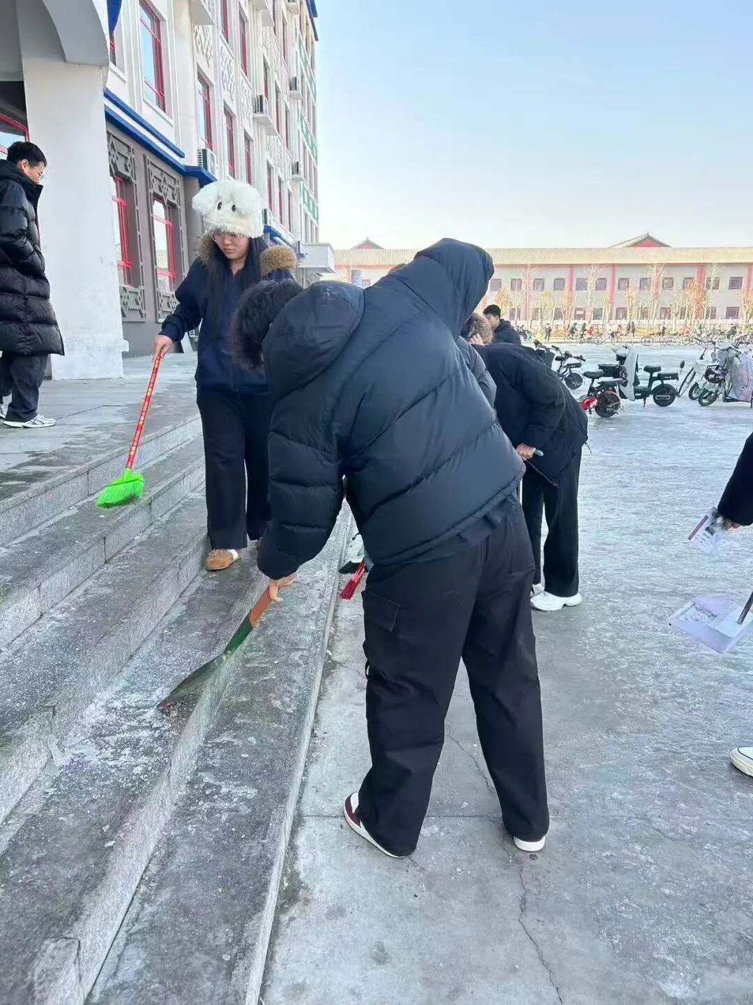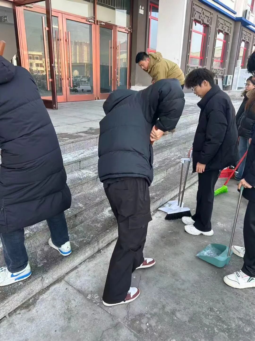 校园寒风凛冽,奖助学金自强自律委员会和资产部的干事们却热情高涨。大家工作很积极集中对教学楼出入口的积雪展开清理。现场分工细致有序:身强力壮的同学用铁锹撬动路面压实的冰雪块,将积雪归拢至路边;心思细腻的同学手持扫帚,仔细清理路面残留的薄雪与碎冰;轻声叮嘱过往师生注意脚下安全。
