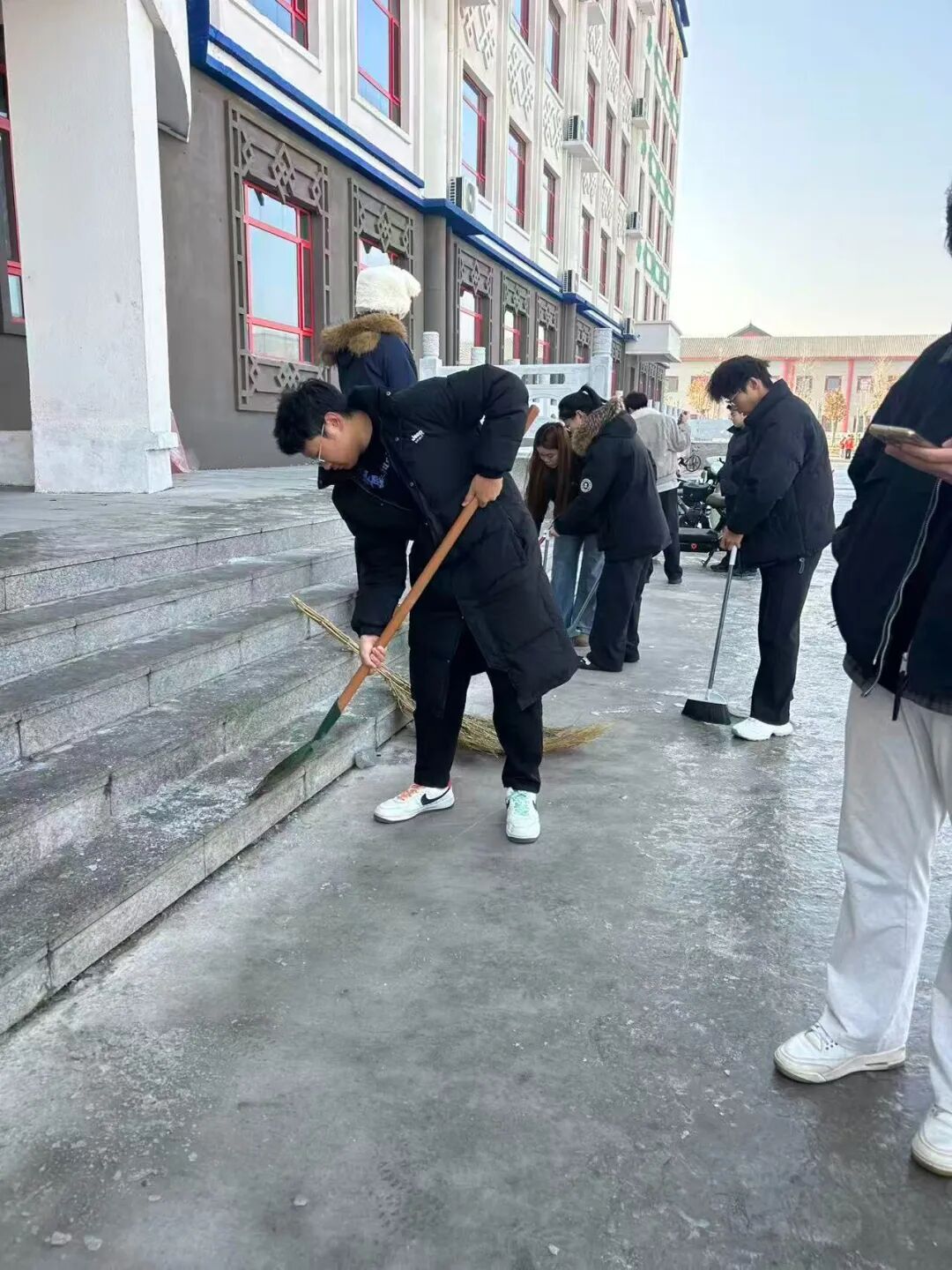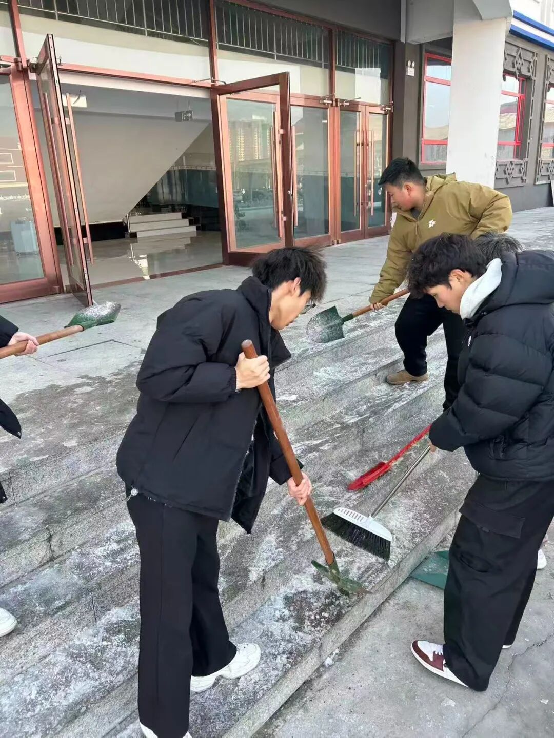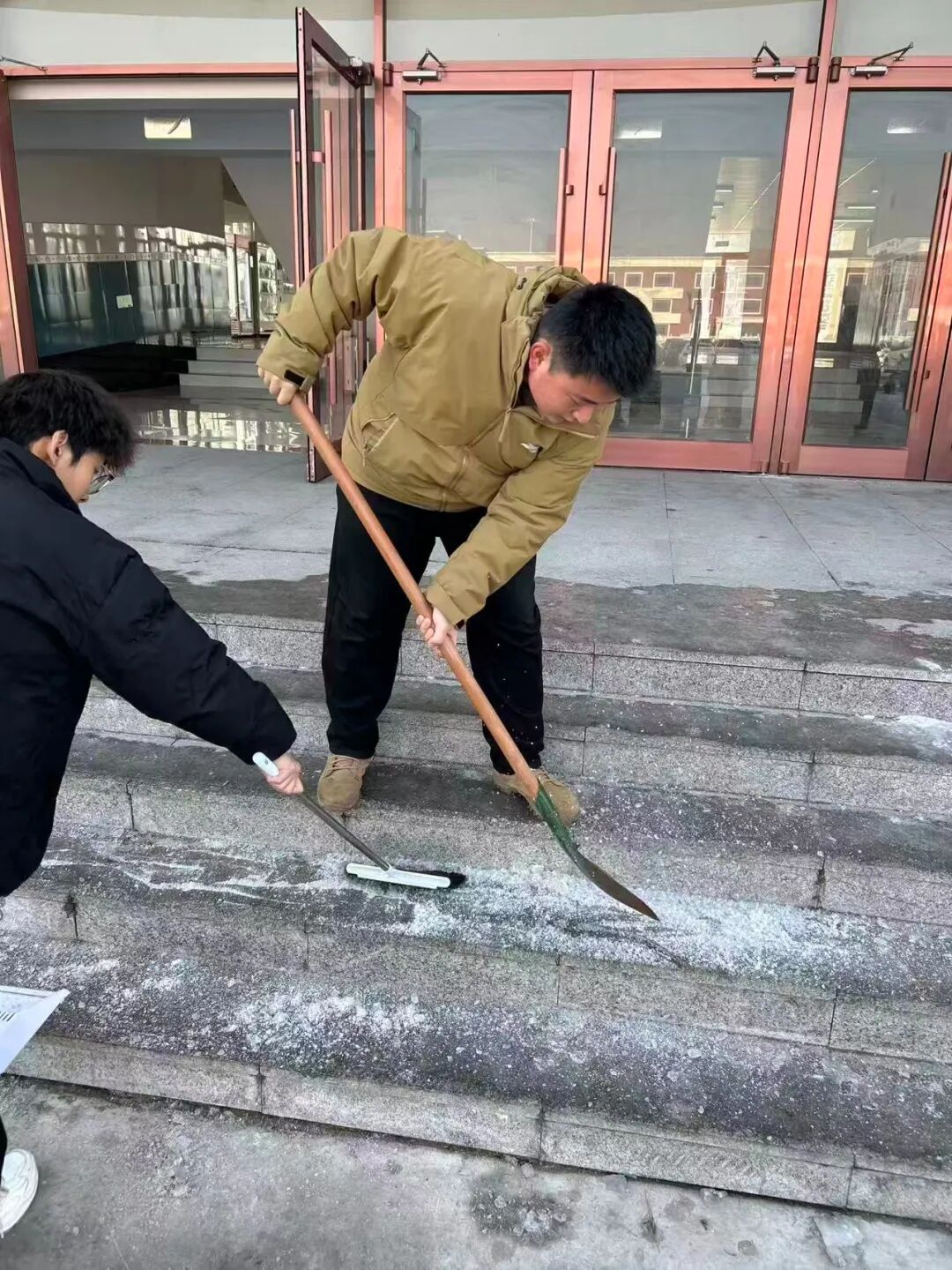 活动筹备阶段,两部门高效联动、分工明确。奖助强调清雪过程中的安全规范,短时间内便集结起一支清雪队伍;资产部门提前摸排教学楼周边易滑路段,精准调配铁锹、扫帚、安排专人将工具分送至指定清雪点位,为活动开展筑牢物资保障。