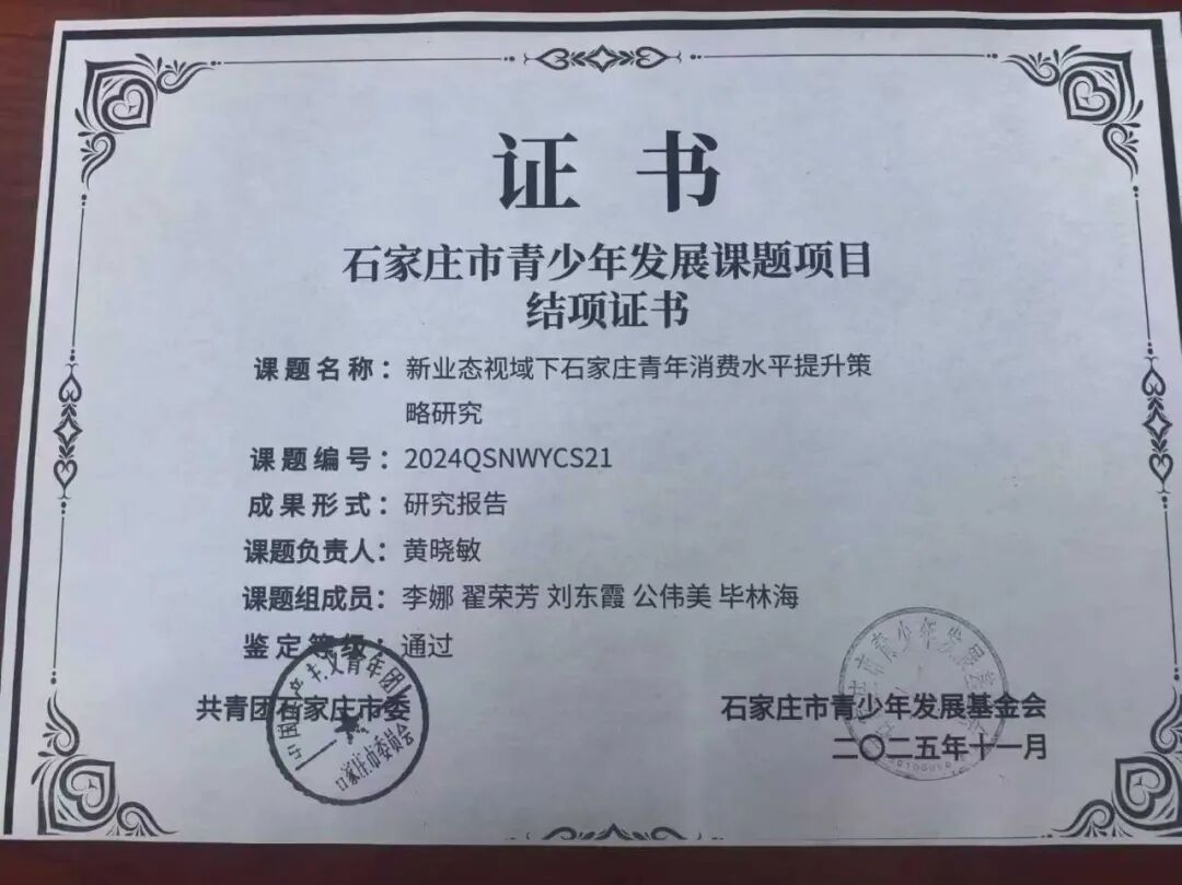 在课题研究方面,学院辅导员团队同样表现突出。黄晓敏老师成功立项石家庄市青少年发展基金会课题一项。该课题着眼于当前青少年发展中的现实问题,结合高校学生工作实际,探索新业态视域下石家庄青年消费水平提高策略。