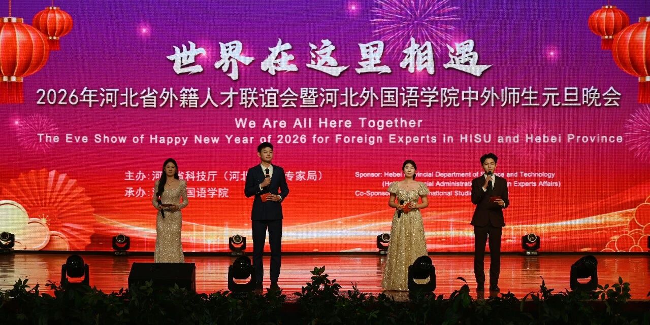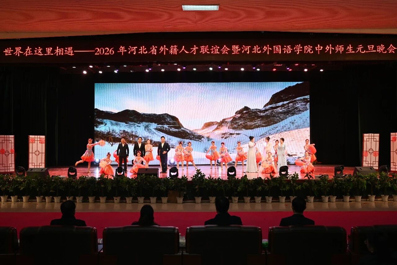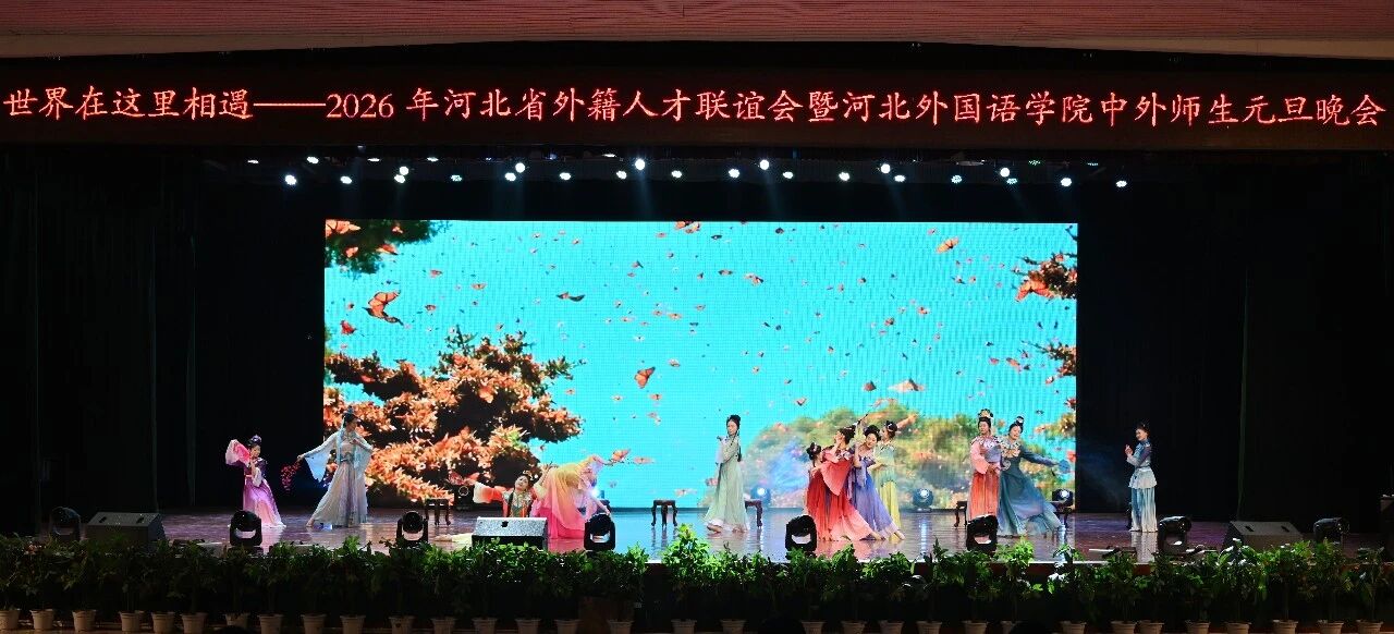 在“一带一路”倡议深入推进、全球发展与文明倡议落地生根的时代背景下,为搭建中外文化交流桥梁,喜迎2026年新年到来,12月30日晚,由河北省科技厅(河北省外国专家局)主办、河北外国语学院承办的“世界在这里相遇”2026年河北省外籍人才联谊会暨中外师生元旦联欢晚会在该校大学生活动中心隆重举行。