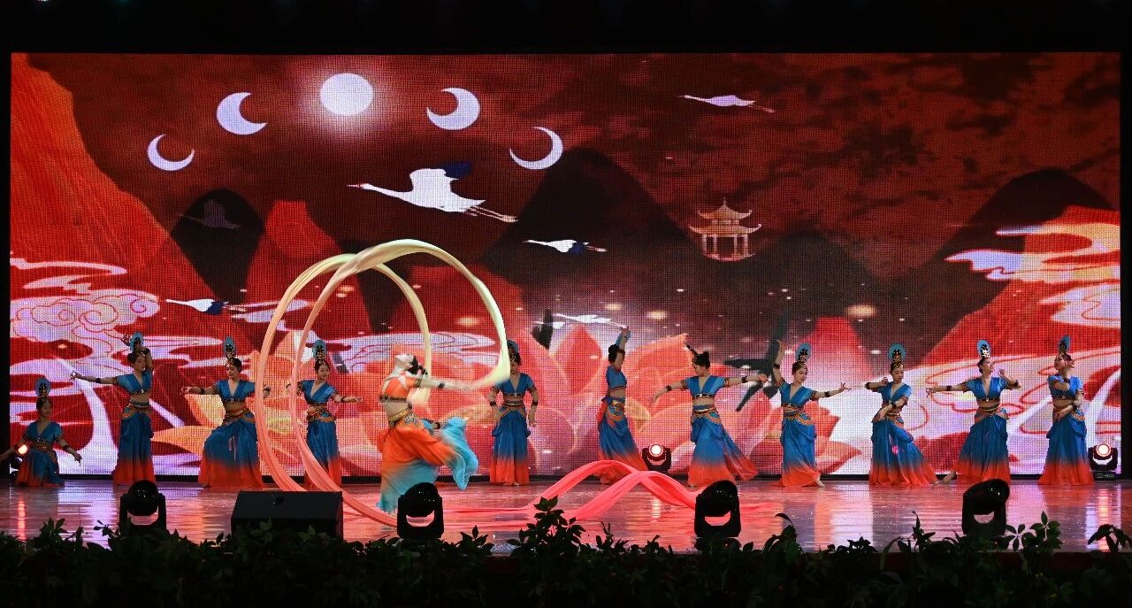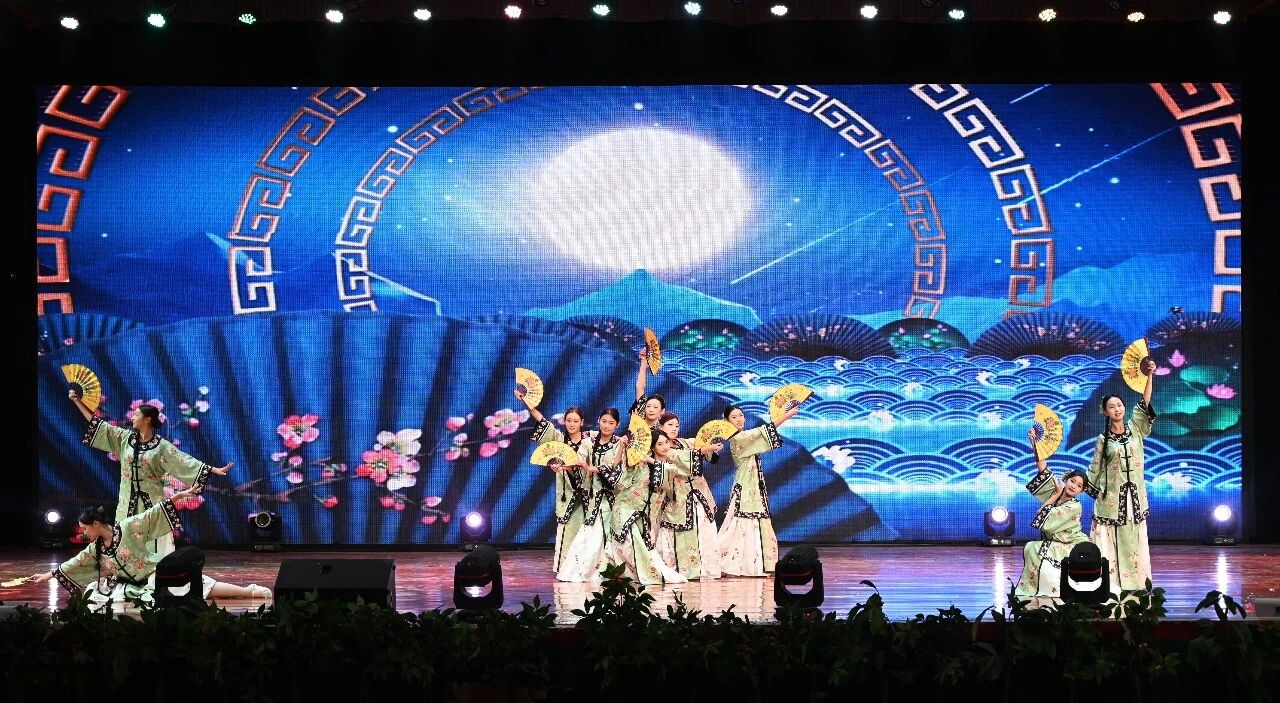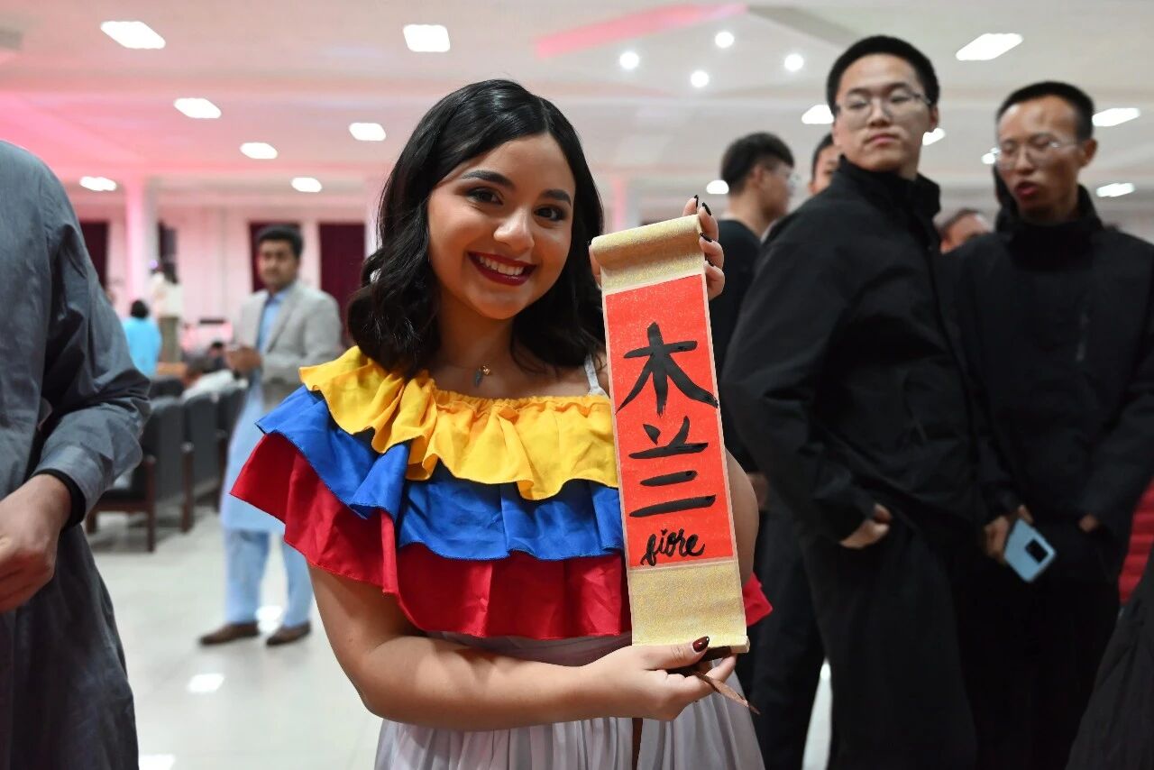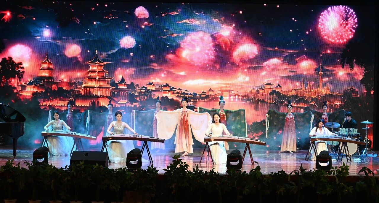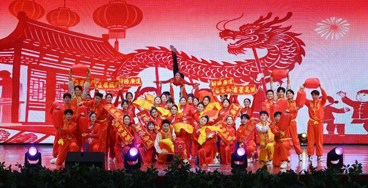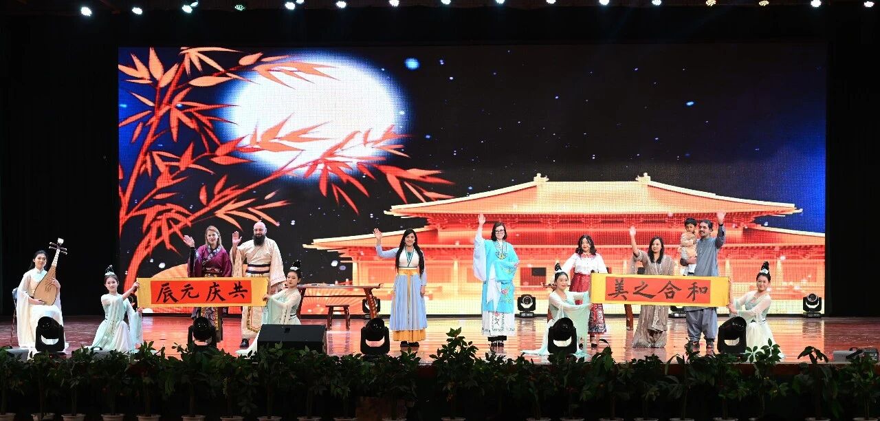 当晚7时,大学生活动中心张灯结彩、暖意融融。开场歌舞《好运全都来》以灵动舞姿与饱满热情点燃现场气氛,拉开了晚会的序幕。整台晚会涵盖歌曲、舞蹈、情景剧、服装展示、诗词朗诵、乐器合奏等22个节目,兼具深厚的传统文化底蕴与鲜明的国际创新元素,勾勒出多元文明和谐共生的生动图景。中外师生联袂演绎的《但愿人长久》将朗诵、歌舞、器乐与书法融为一体,传媒学子的经典诵读与外籍专家的笔墨挥毫相映成趣,艺术师生的曼妙演绎让诗词古韵直抵人心;《乐响四方》汇聚古筝、琵琶、二胡等中国传统乐器与萨克斯、小提琴、架子鼓等西方乐器,搭配动感拉丁舞,东西方音律碰撞交融,将晚会推向高潮,赢得全场阵阵喝彩。晚会上,灵动的脸谱与飘逸的敦煌飞天等中国非遗文化元素相互交织、激情碰撞,宛如一幅绚丽多彩的画卷徐徐展开,瞬间吸引了在场中外师生的目光,让他们沉醉于这独特的东方韵味之中。