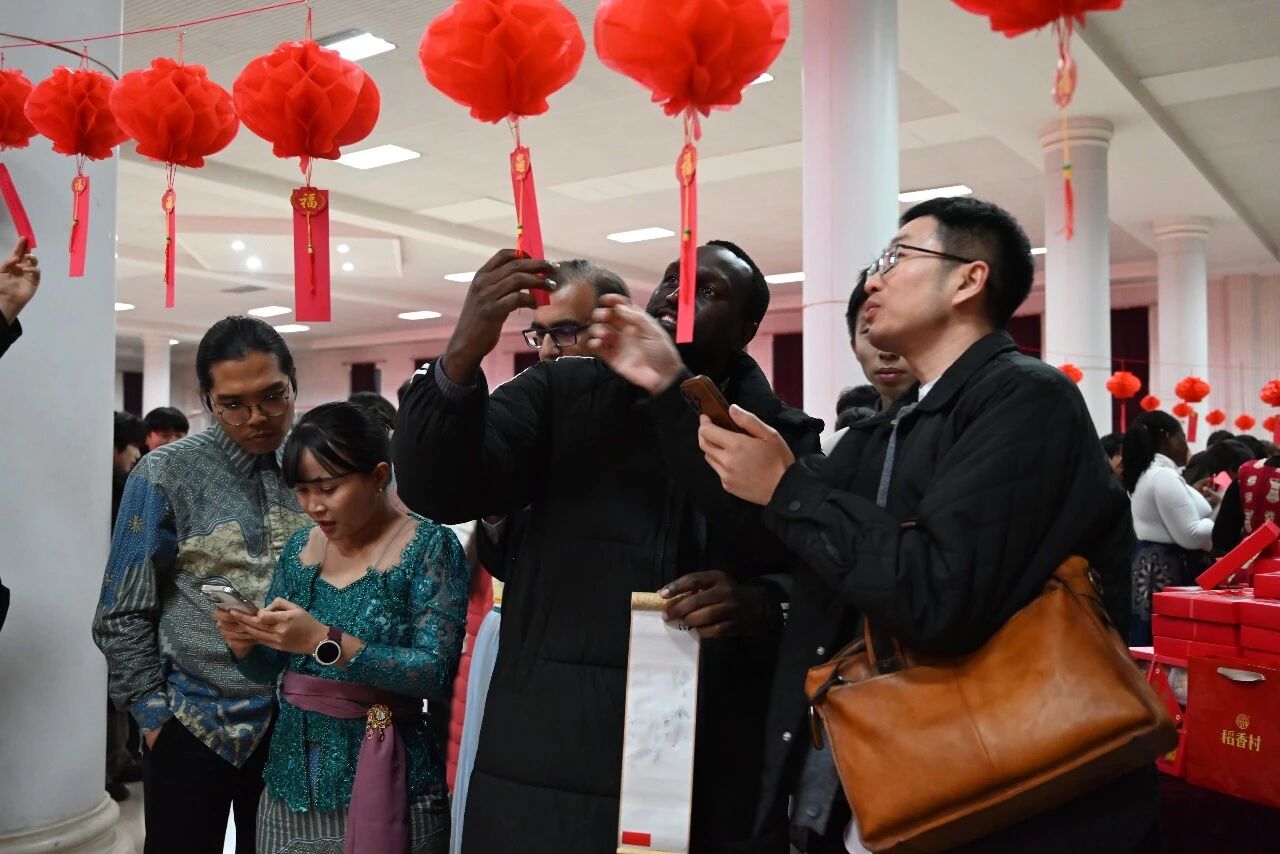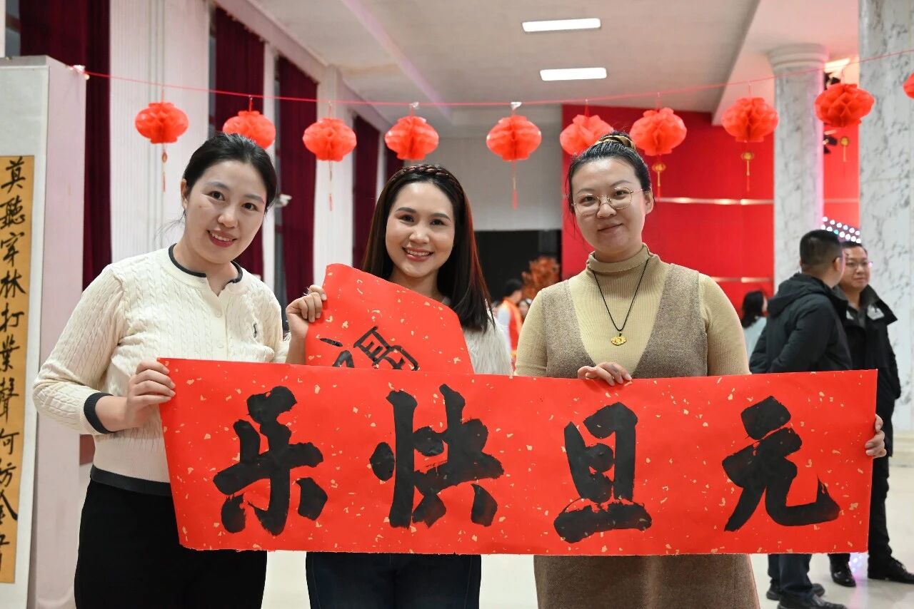 晚会现场精心设置的“文化长廊”成为中外文化交流的重要窗口。剪纸、书法、猜灯谜等河北民俗体验区前人头攒动,琳琅满目 的特色饰品、精巧雅致的手工制品与栩栩如生的国画作品,让外籍教师和留学生沉浸式感受中国传统文化魅力。河北省科技厅为外籍专家、留学生准备的中国特色糕点等新年礼物,更让大家感受到浓浓的暖意。